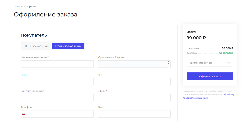 Все этапы сделки представлены на одной странице. Клиенту не нужно перемещаться между разделами — он может просто заполнить форму и подтвердить заказ. Это особенно актуально при использовании мобильной версии сайта.