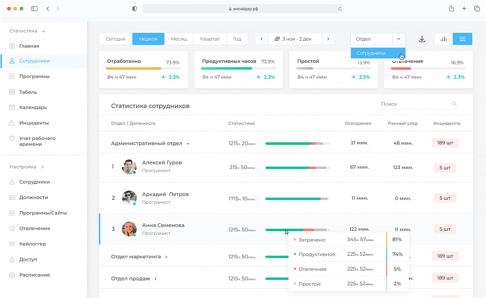 ИНСАЙДЕР доступен как в десктопной, так и в мобильной версии. На смартфоне можно в онлайн-режиме отслеживать действия работников и знакомиться с отчетами за любой период.