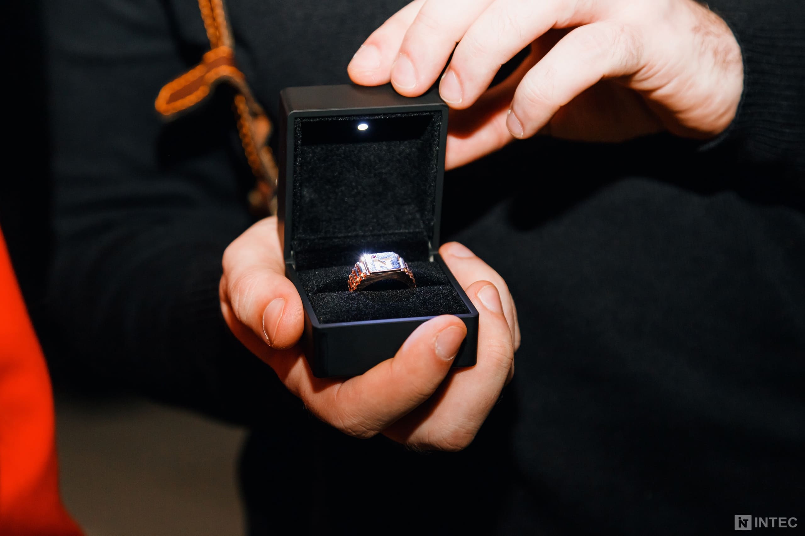 Особый момент вечера — традиция, которую мы бережно сохраняем из года в год — поздравление коллег с юбилейными датами работы в INTEC. Руководители компании Ярослав Голуб и Светлана Веденеева вручили золотой перстень с корпоративной символикой нашему сотруднику Алексею в знак благодарности за вклад в развитие INTEC.