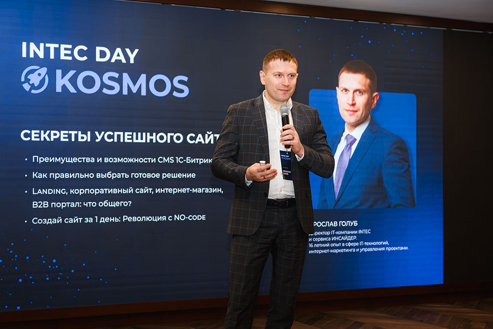 Главным событием дня стала презентация INTEC.KOSMOS — инновационной платформы со встроенным искусственным интеллектом. Это не просто готовый сайт на «1С-Битрикс», а полноценный инструмент для запуска многофункциональных ресурсов. Среди ключевых преимуществ: