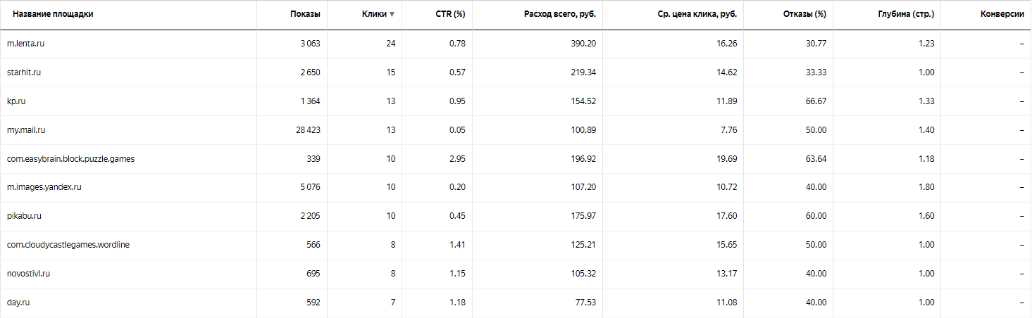 Отключение неэффективных площадок с высокими тратами и низким CTR или же наоборот, слишком высоким CTR. В основном это были площадки мобильных приложений.