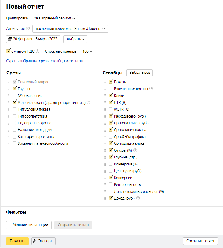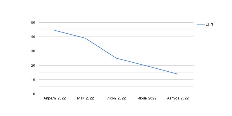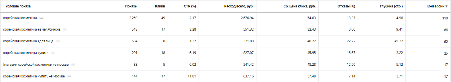Работа с ключевыми словами и ставками. Мы анализировали данные по расходу и уровню ДРР в Яндекс.Метрике. Затем на их основе принимали решение о корректировке ставок по конкретным ключам или об отключении неэффективных ключевых слов. В некоторых случаях меняли тип соответствия ключевого слова на точный для показа по релевантным запросам.