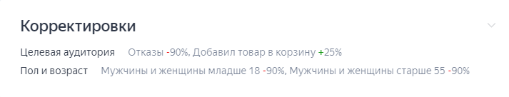 Работа с корректировками ставок. Настройку корректировок делали в соответствии с эффективностью по мобильным устройствам, полу и возрасту, сегментам аудитории. По последнему меняли ставки так: