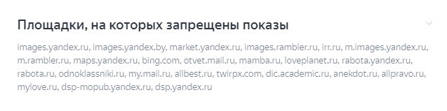 • Блокировка нецелевых площадок. По результатам анализа эффективности показов по публикациям в РСЯ площадки с низким CTR, высокой стоимостью за клик и отсутствием конверсий были добавлены в черный список.