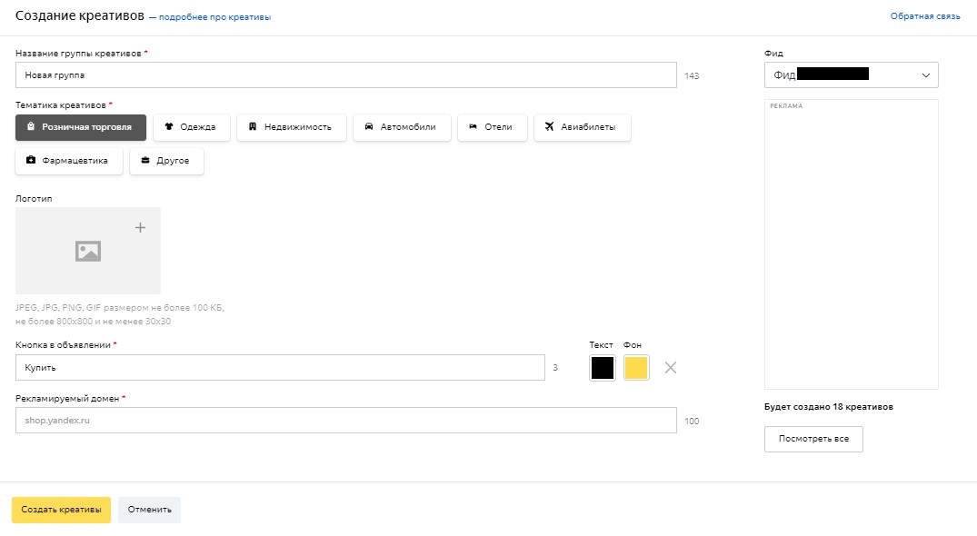 Разработка и настройка рекламных объявлений происходила через конструктора креативов Яндекс.Директ для смарт-баннеров. В процессе работы мы: