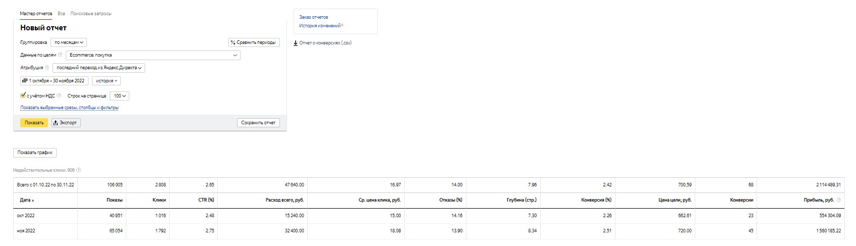 Рекламная кампания проводилась с 1 октября по 30 ноября 2022 года. Уже в ходе первого месяца на основе промежуточных результатов мы внесли корректировки в настройки стратегии: