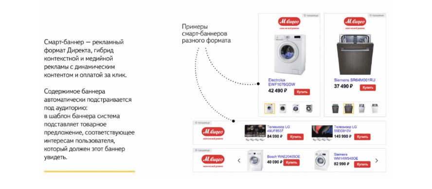 Смарт-баннеры особенно эффективны для крупных каталогов с десятками тысяч SKU. Они динамически подбирают изображения, заголовки и описания товаров, подходящие конкретному пользователю. Это позволяет повысить CTR и конверсию за счет большей релевантности, а также снизить нагрузку на команду по созданию и актуализации креативов. Формат баннера информативен, визуально выделяется на фоне стандартной рекламы и хорошо работает как в сетях публикаций, так и в ремаркетинговых кампаниях.