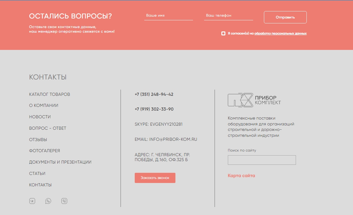 Подробную контактную информацию вывели в футер (номер телефона, адрес, email). Также есть возможность заказать обратный звонок с сайта.