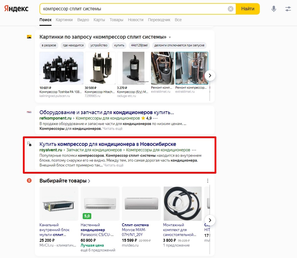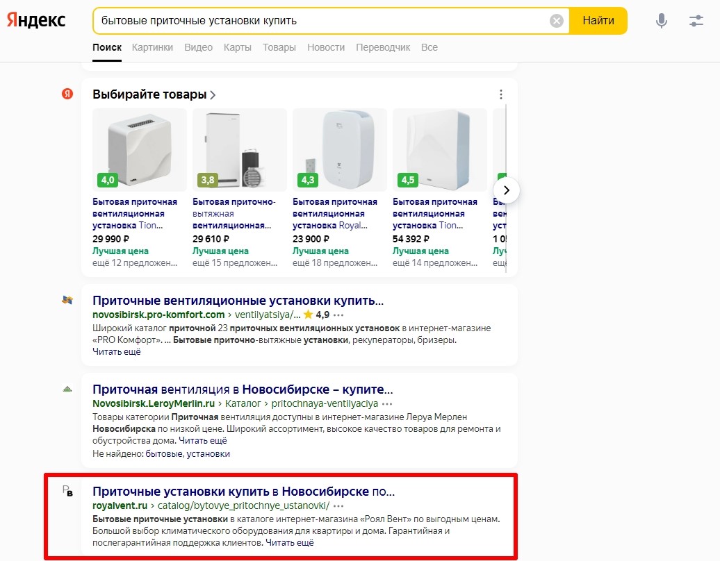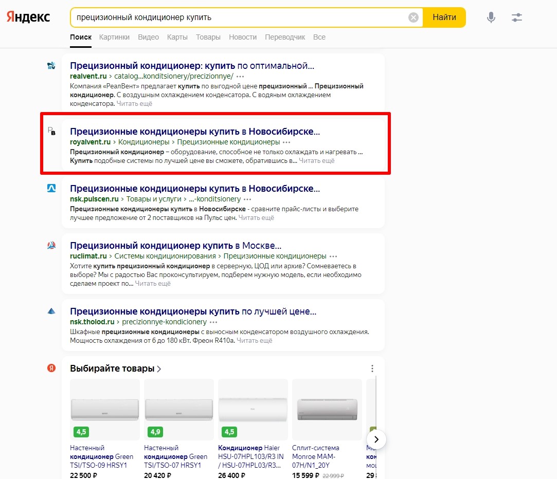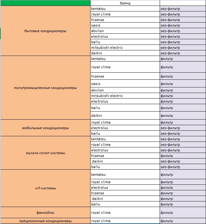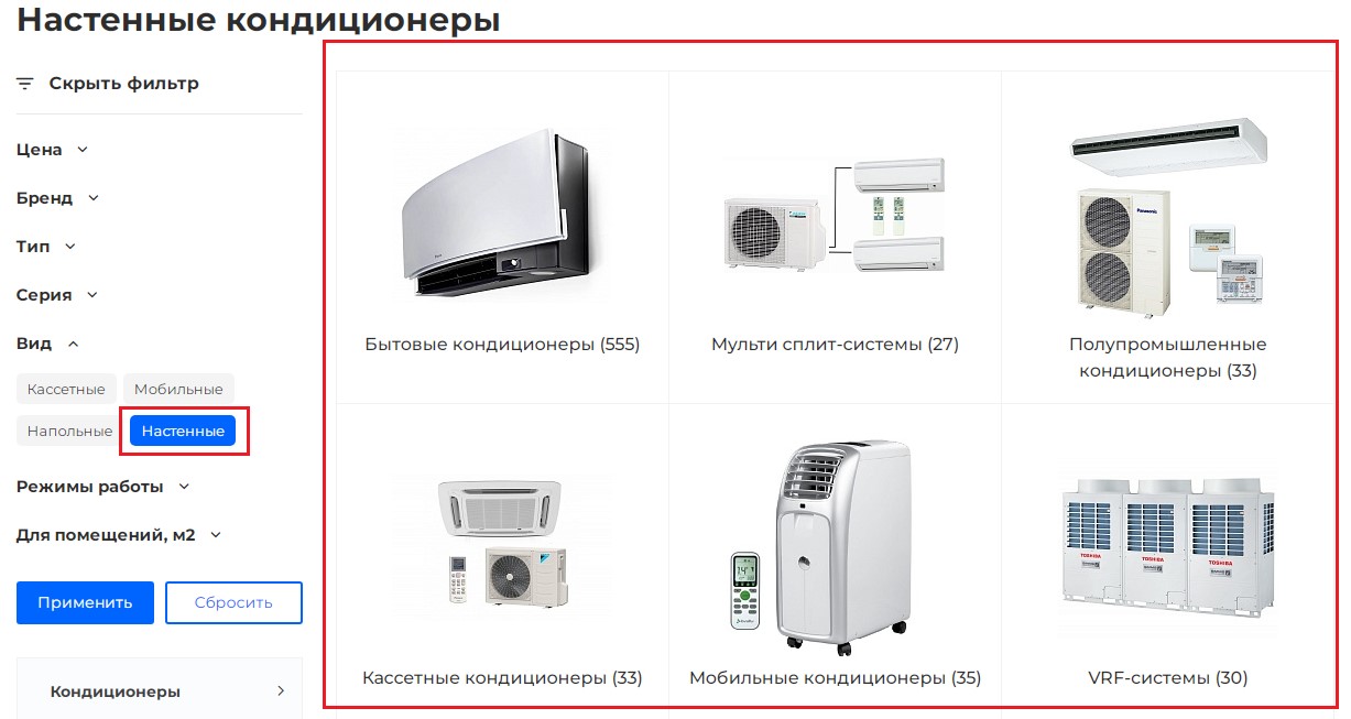 3.Также мы разработали фильтры для каталога, чтобы сделать его более простым. Например, в разделе «Кондиционеры» добавили характеристику «Настенный» и создали на основе этого свойства посадочную страницу, которая вышла в топ.