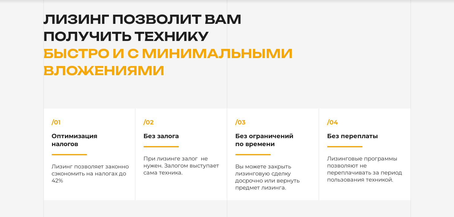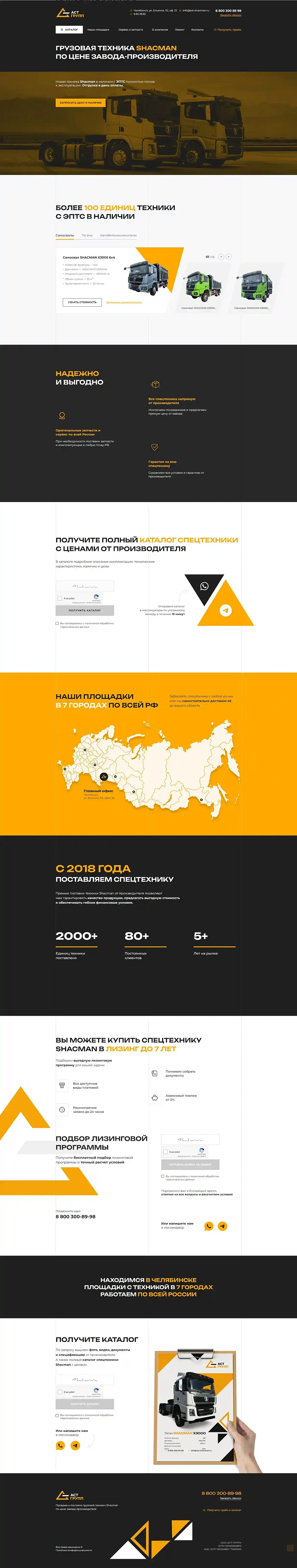 Идея клиента заключалась в создании сайта в формате Landing Page, чтобы пользователи могли получить всю необходимую информацию о компании и ознакомиться с предлагаемым модельным рядом спецтехники в пределах одной страницы.