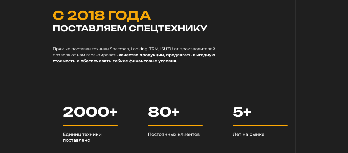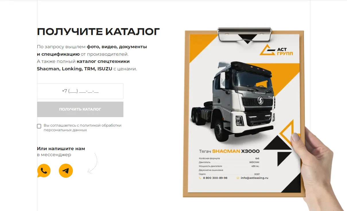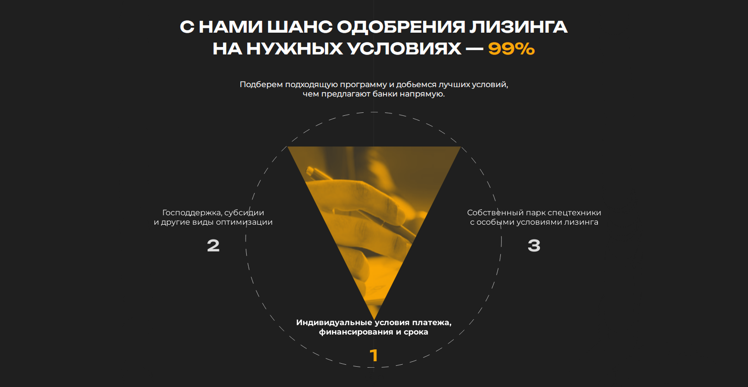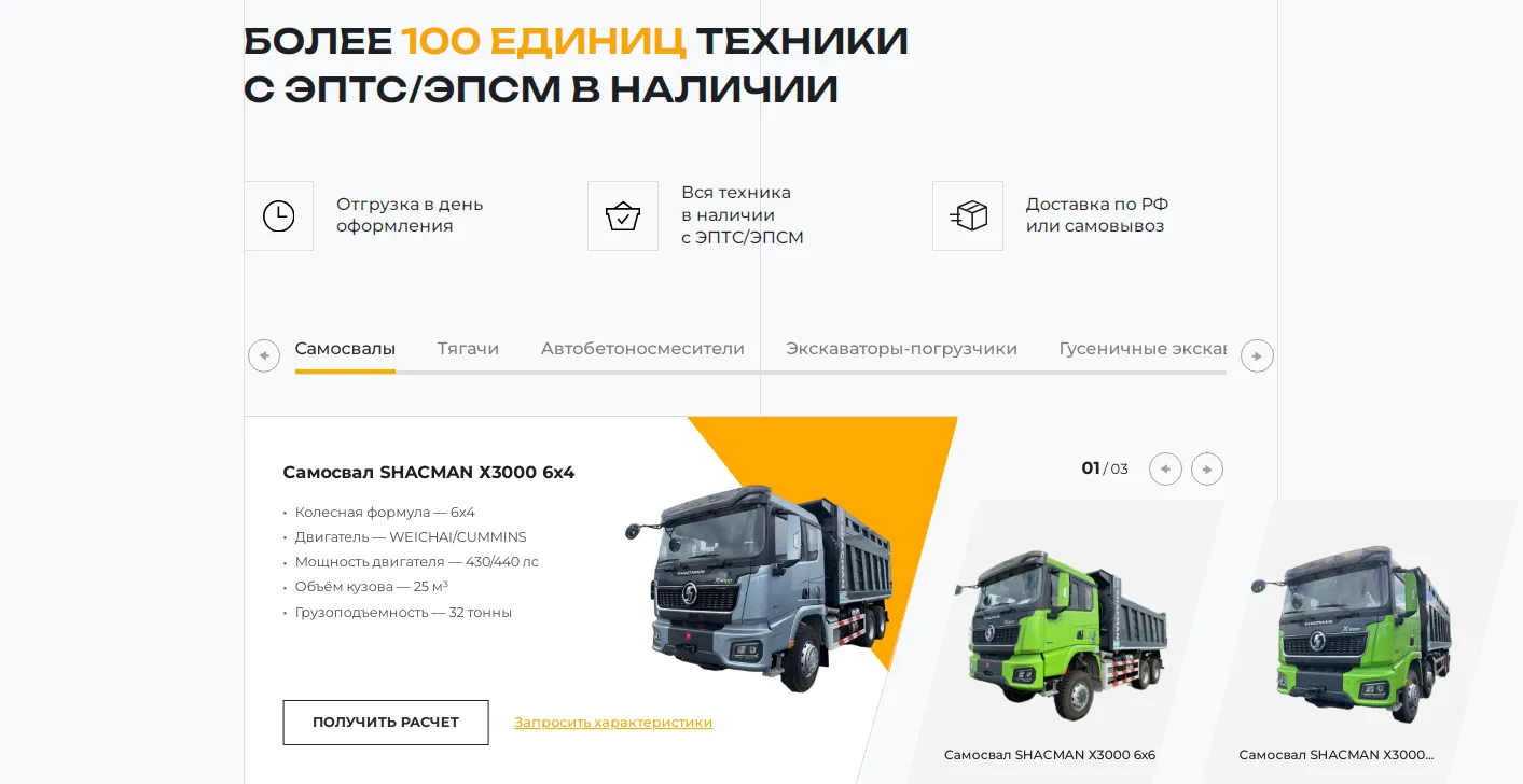 Показ широкого спектра моделей спецтехники подчеркивает разнообразие ассортимента, а прямой доступ к информации повышает вероятность того, что посетители сайта быстро найдут то, что им нужно, и отправят заявку.