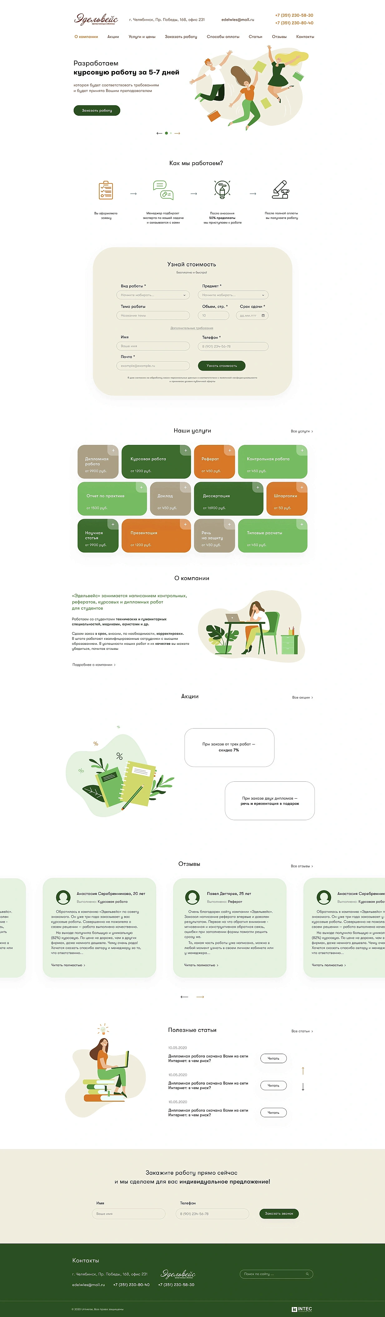 Наша компания оказывает услуги по написанию студенческих работ и предоставляет консультации студентам и школьникам. Пожеланий к сайту было много и самое главное - нужно было разработать калькулятор для вычисления стоимости написания работы. В результате мы получили стильный и удобный сайт, который имеет запоминающийся дизайн и необходимый функционал. По срокам не подвели. Приятно работать с командой профессионалов.