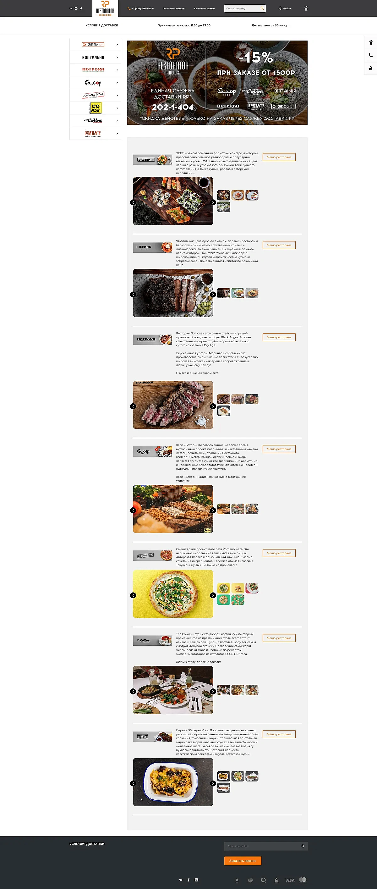 На главной странице все рестораны выводятся в виде левого меню. Схема простая, клиент выбирает ресторан, затем заказывает блюдо. Заявка с корректными, максимально точными данными направляется в нужный ресторан.