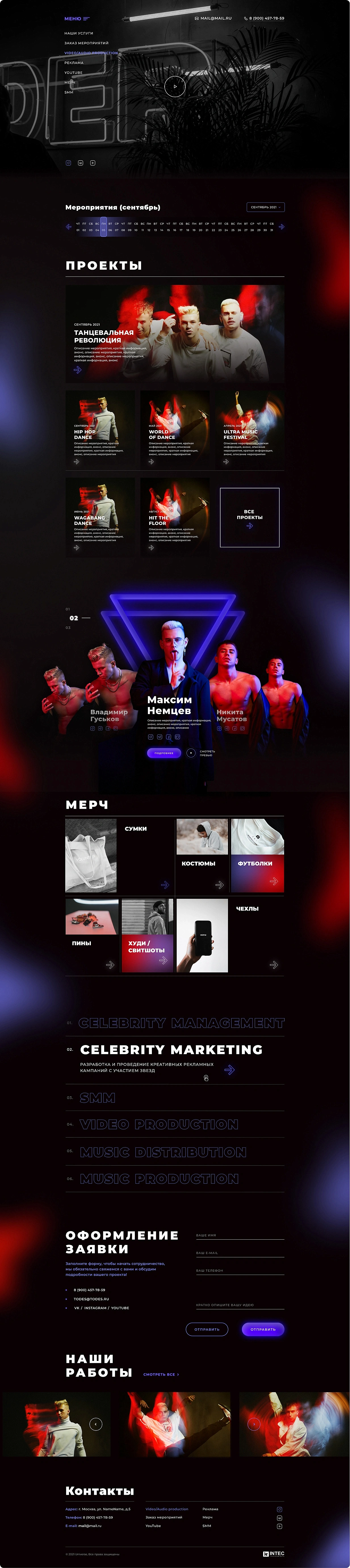 Перед началом работы клиент специально для сайта провел фотосессию артистов в неоновом цвете. Снимки легли в основу дизайна сайта. Он также выполнен в неоновых оттенках (красный и фиолетовый). В дизайне использован неон, чтобы показать «нечто из будущего» – прогрессивность, современность проекта.