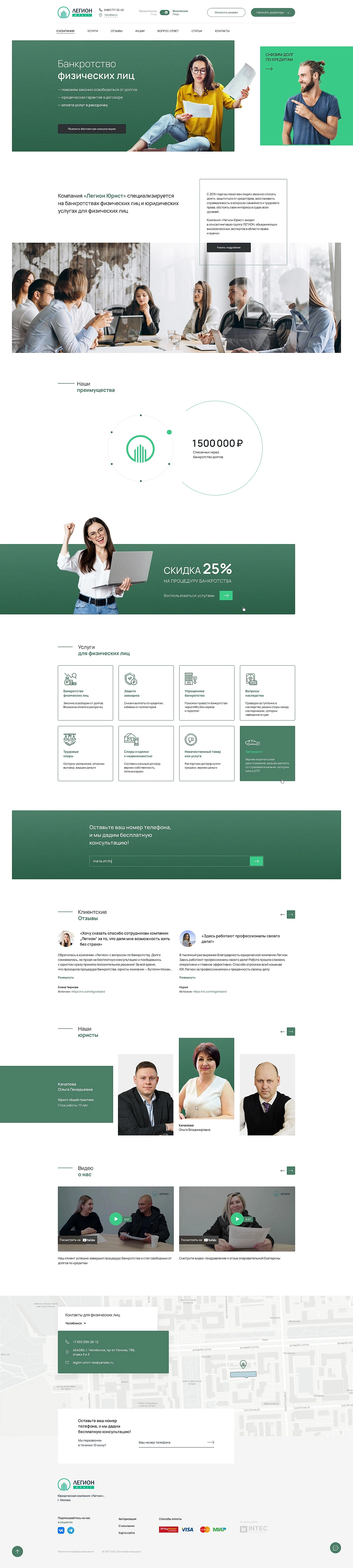 Страницы оформили минималистично, с зелеными акцентными элементами.В маркетинге этот цвет используют, чтобы продемонстрировать дружелюбие, стабильность и безопасность бренда. Такое описание хорошо подходит юридической компании.
