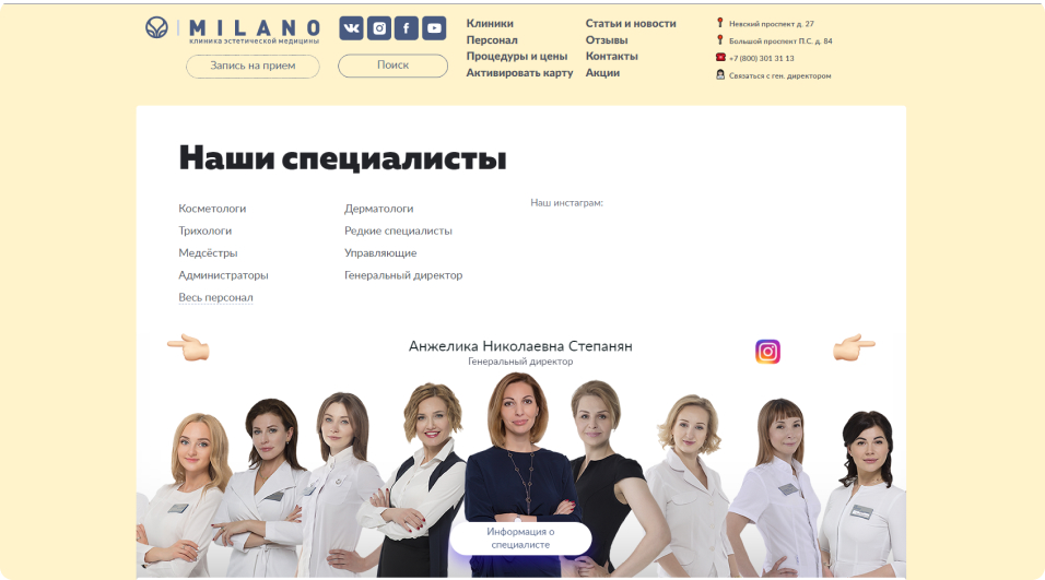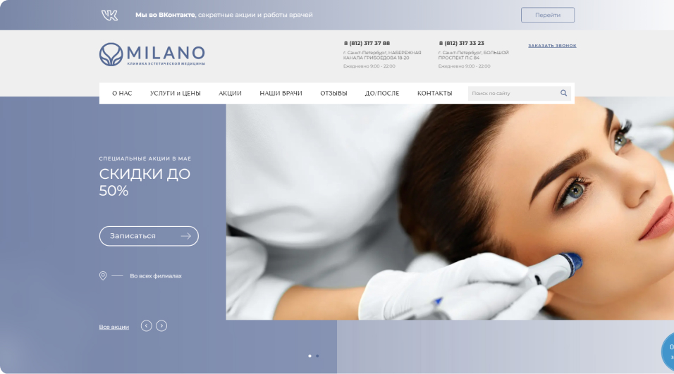 Корпоративный сайт MILANO, лицензированная клиника эстетической медиыцины в центре Петербурга.