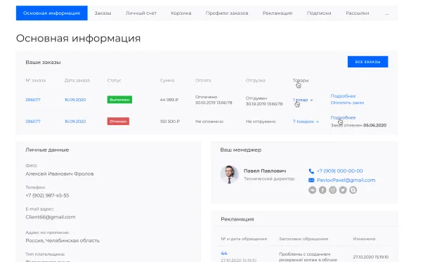 Кабинет идеально подходит для сайтов производственных компаний, оптовых поставщиков и розничных продавцов, которые занимаются онлайн-продажей товаров.