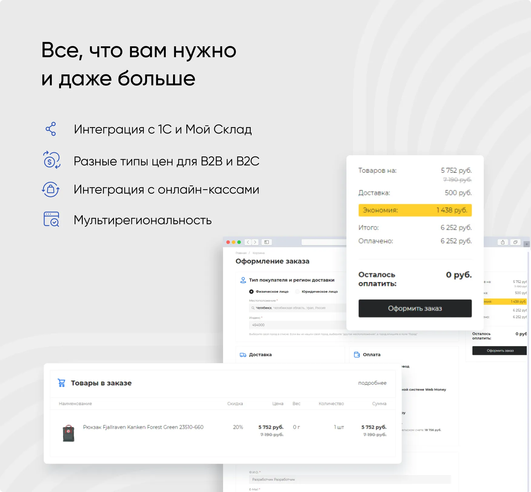 Если ваш интернет-магазин осуществляет доставку по всей России, вы можете дополнительно подключить модуль «INTEC: Мультирегиональность», который позволяет предоставлять пользователям актуальную информацию по их региону. Модуль производит подмену цен, остатков по складам и даже может показывать разные каталоги товаров в зависимости от региона.
