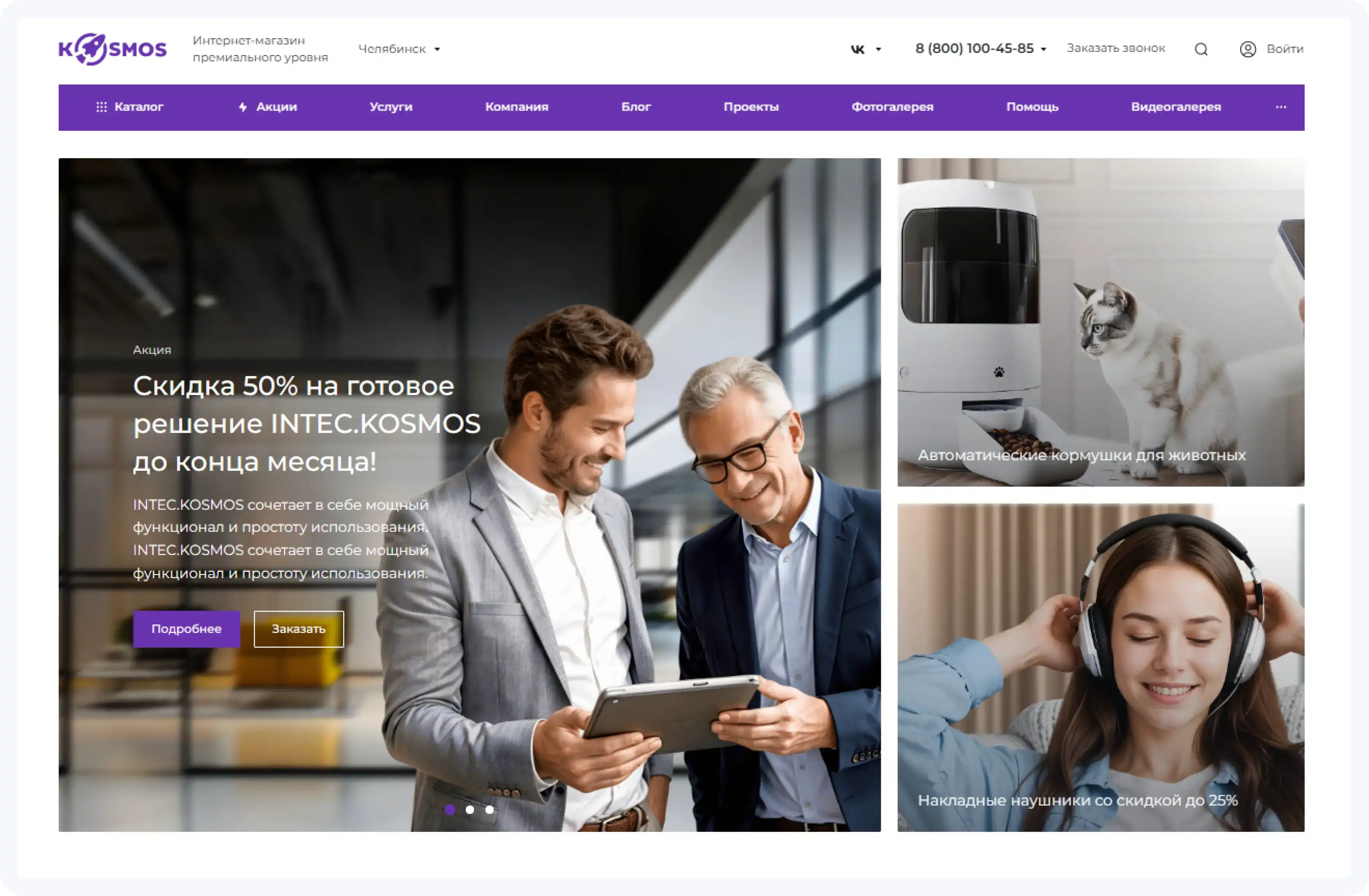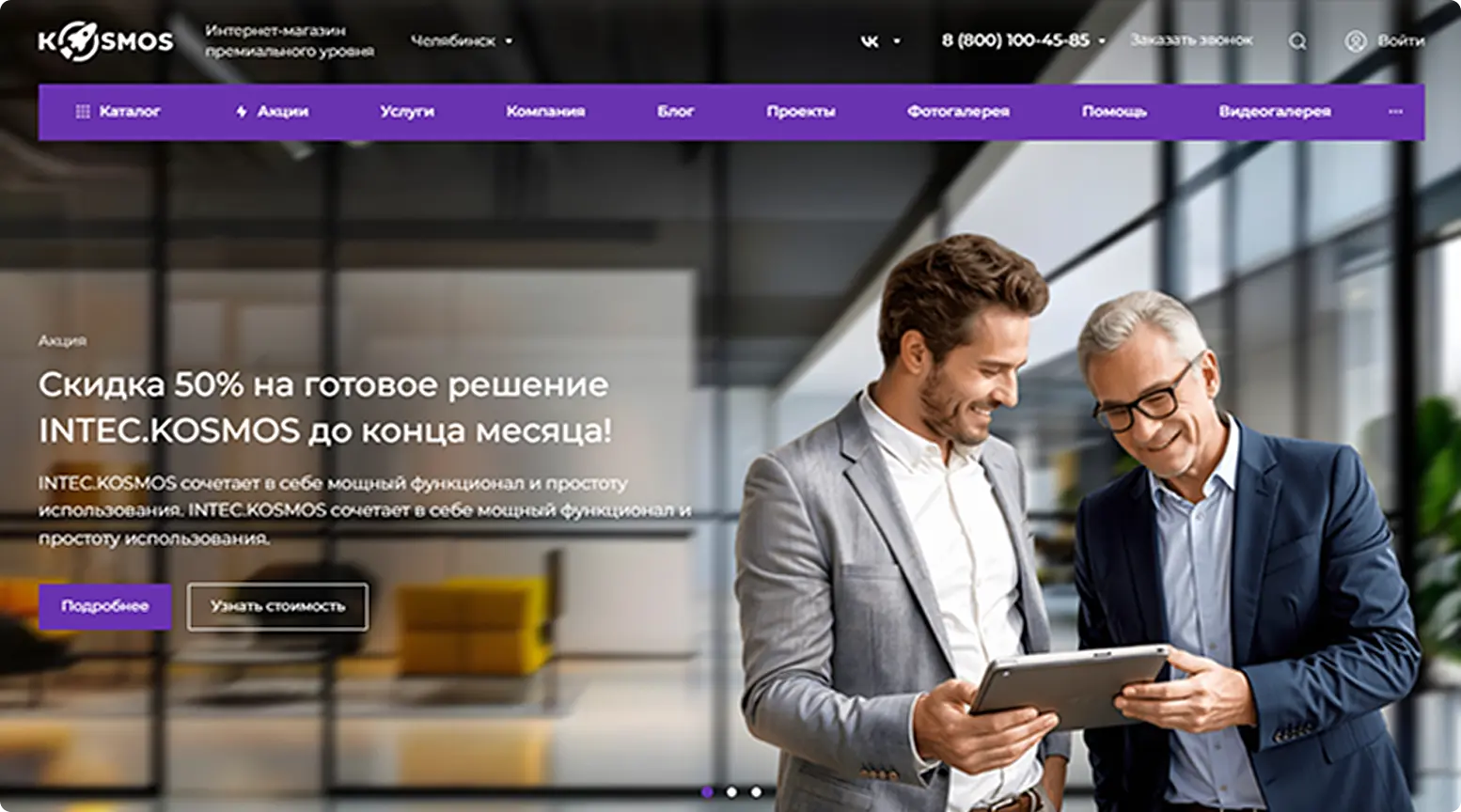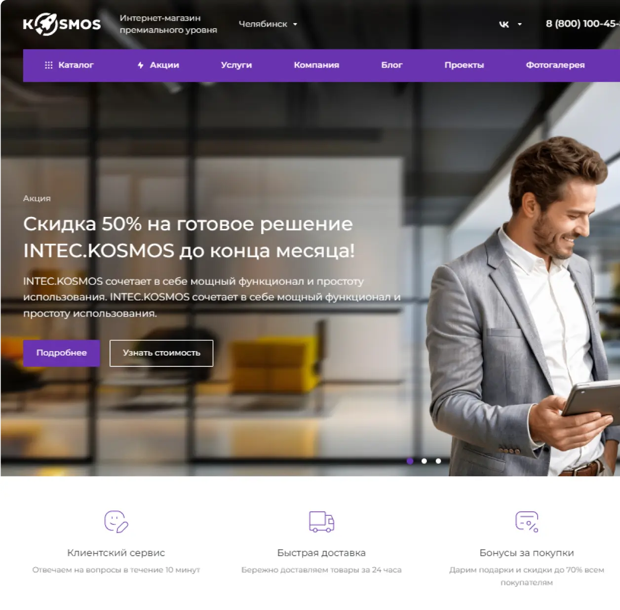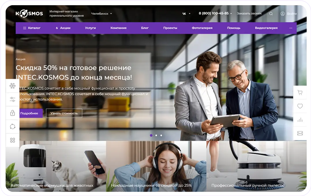 Сайты, созданные на платформе Intec.Kosmos, имеют такой же уровень качества, как и индивидуально разработанные проекты — пользователи не увидят отличий.