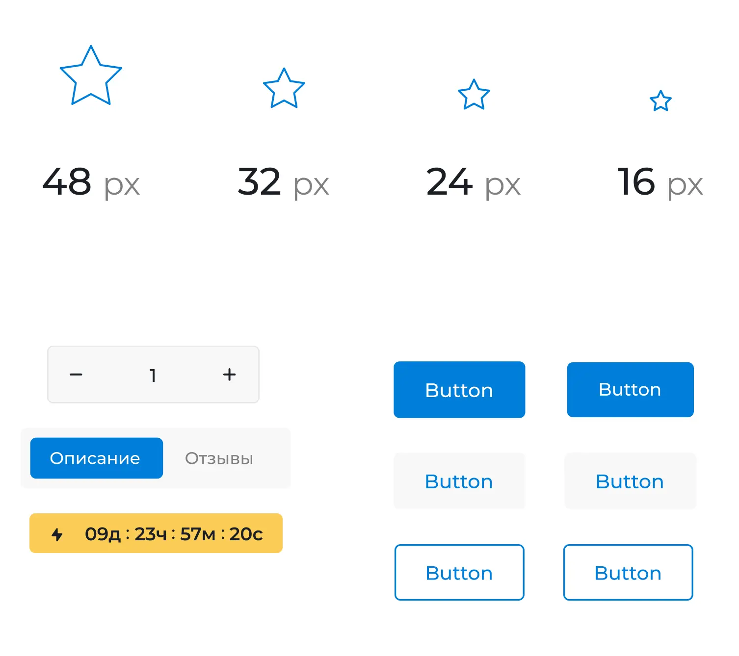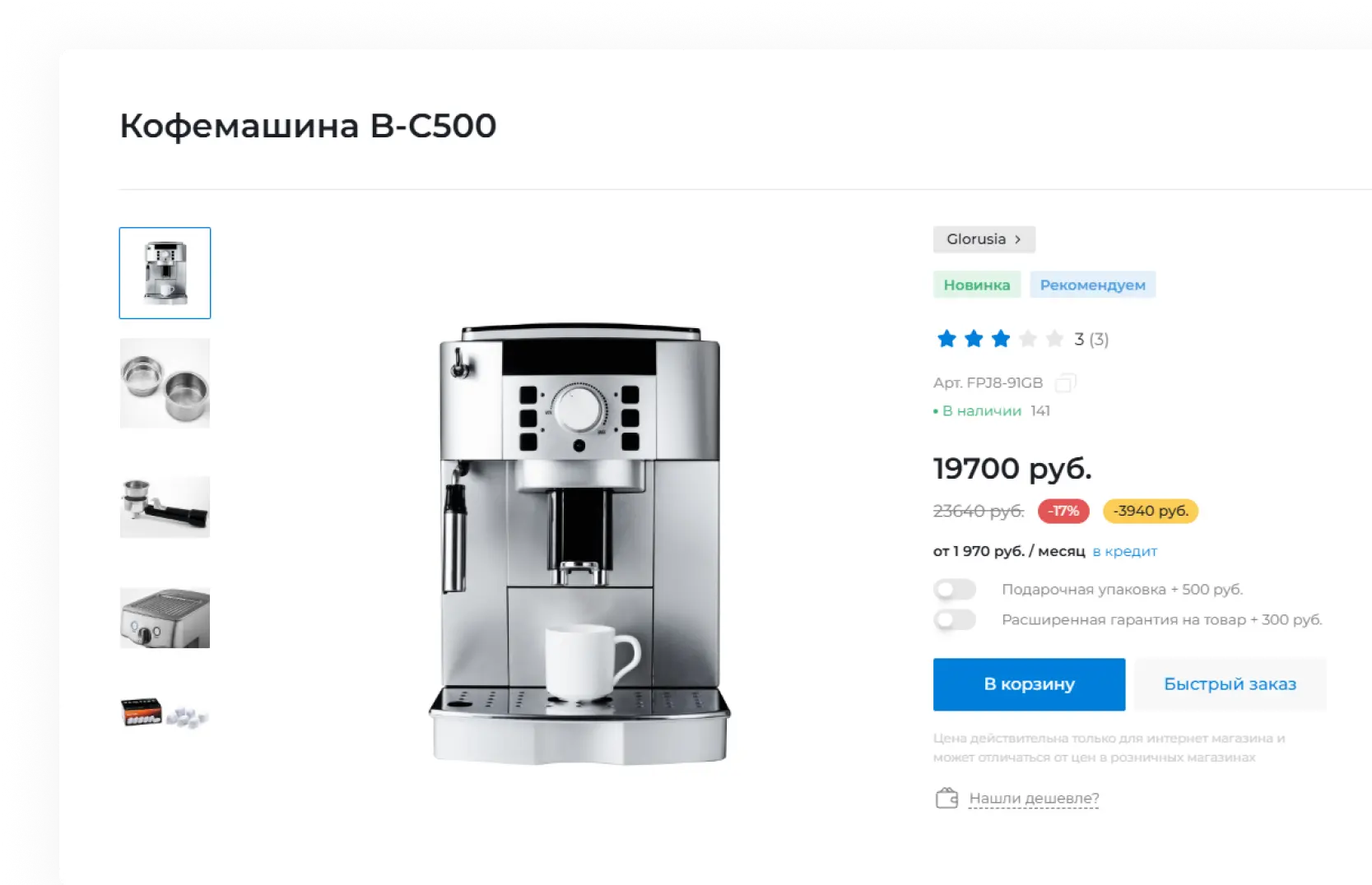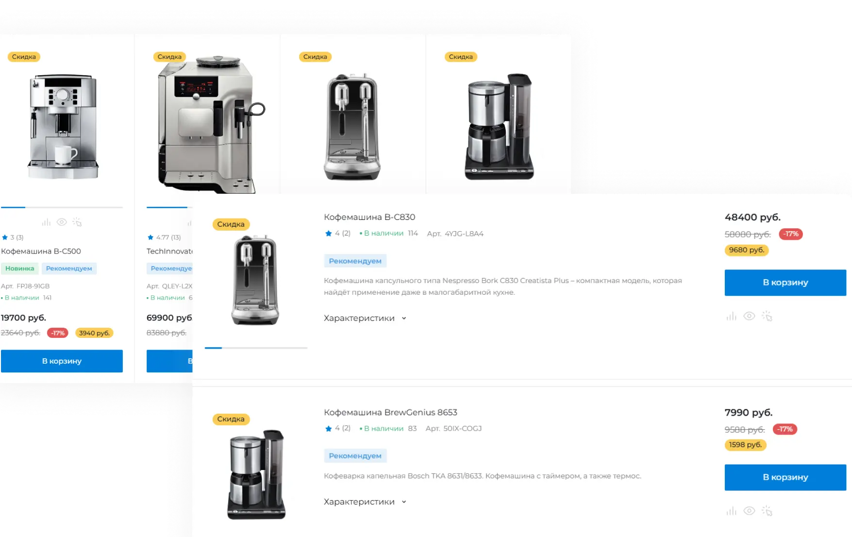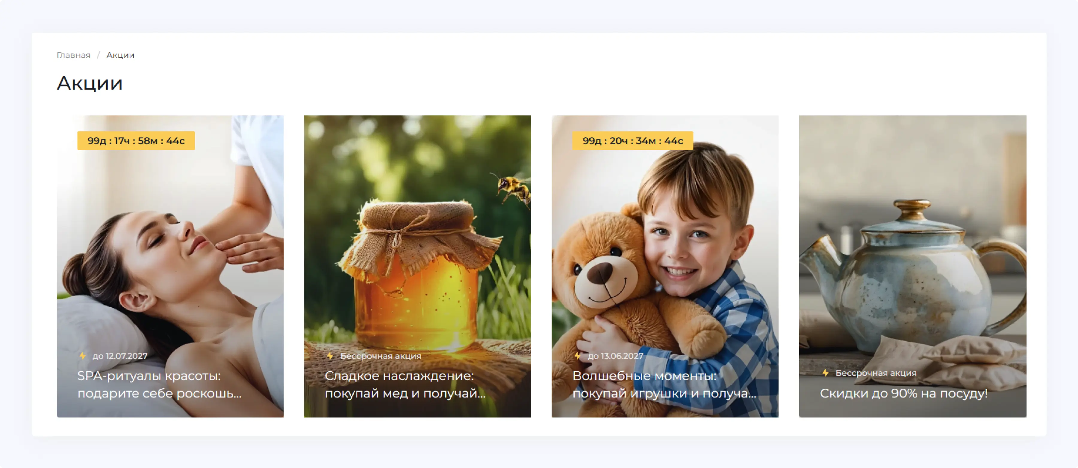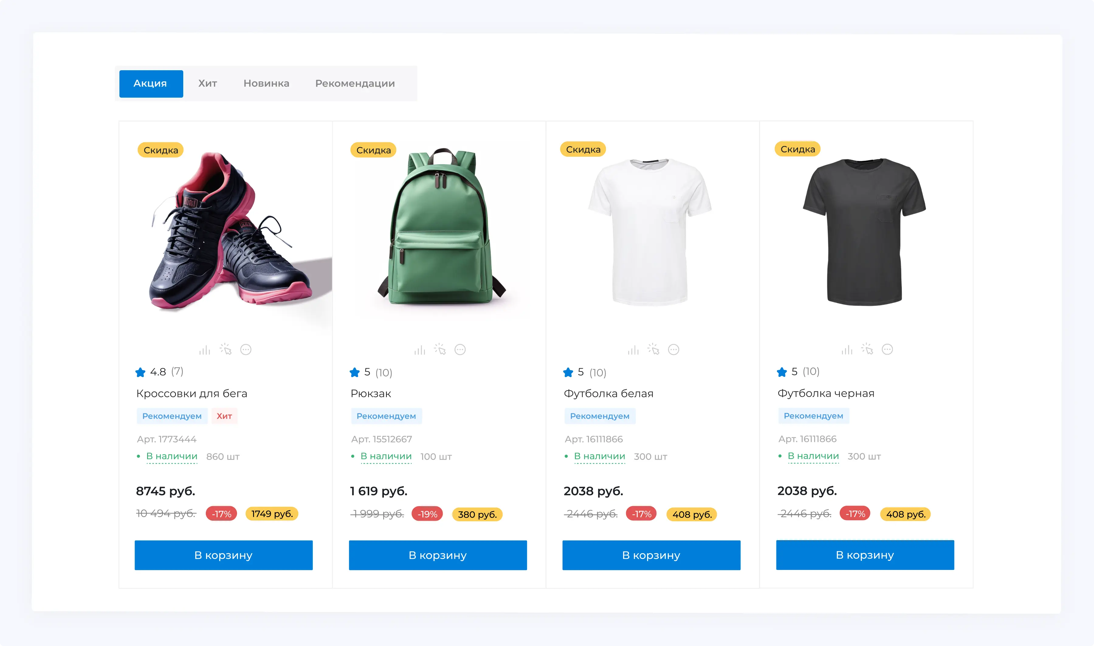 Набор маркетинговых инструментов для привлечения интереса покупателя — стикеры «Хит», «Акция», «Рекомендуем», таймер окончания акции, размер скидки и многое другое.