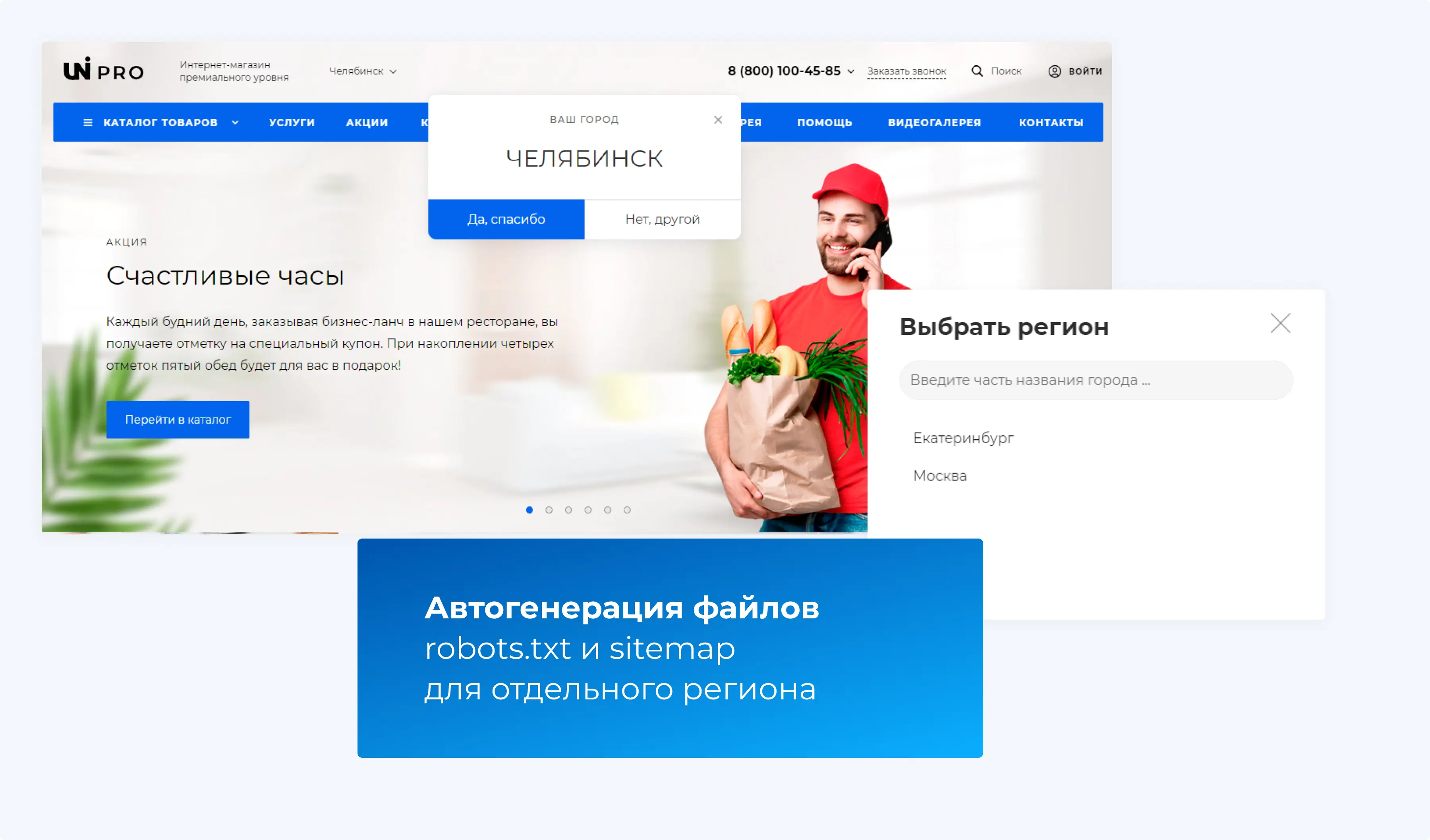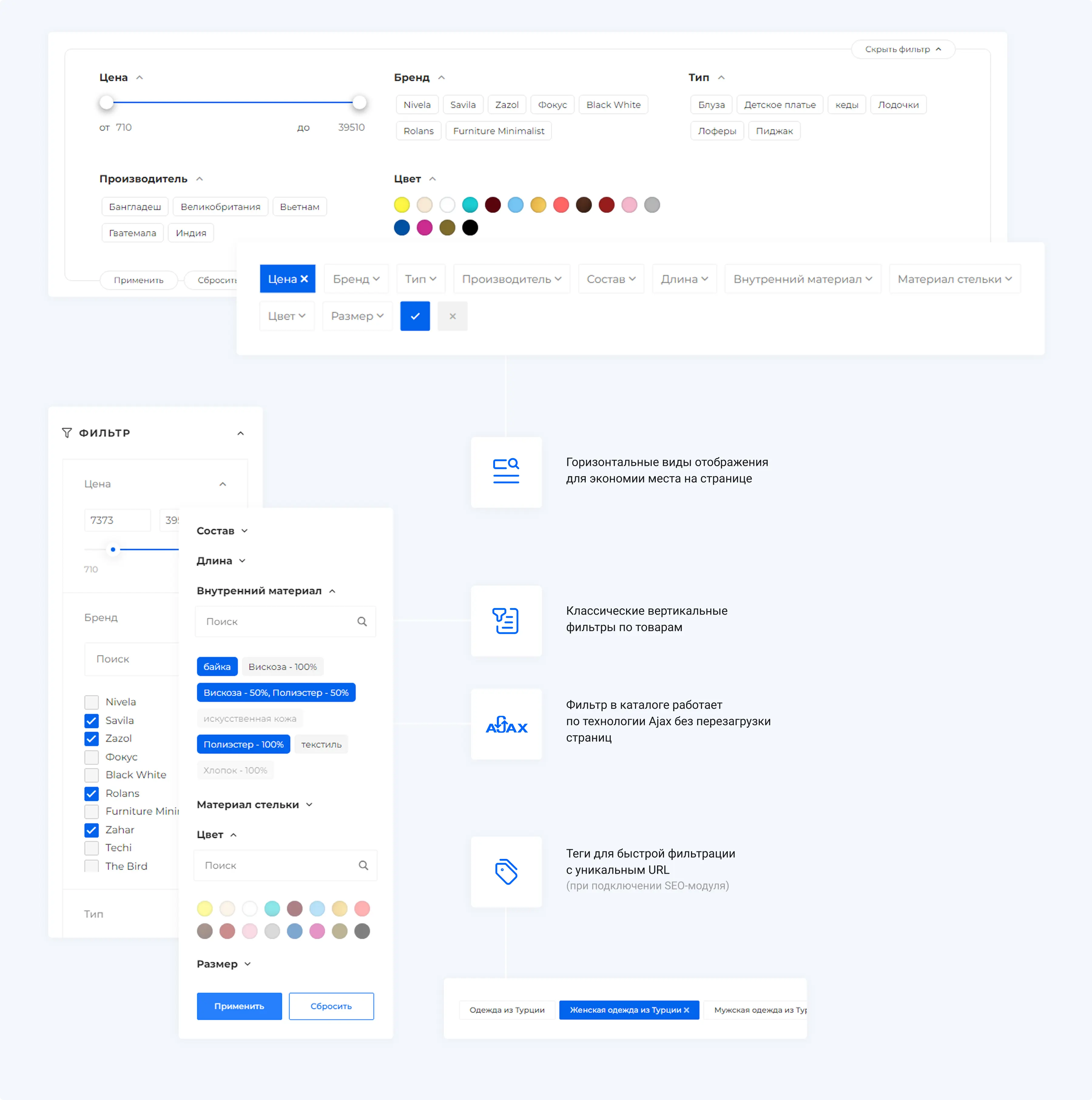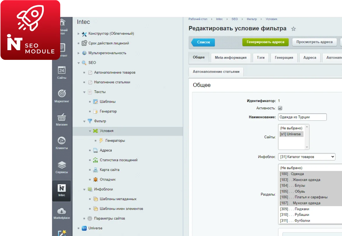 Модуль включает автогенератор уникальных текстов и SEO-фильтр, который позволяет настраивать мета-данные и создавать посадочные страницы для фильтрации товаров